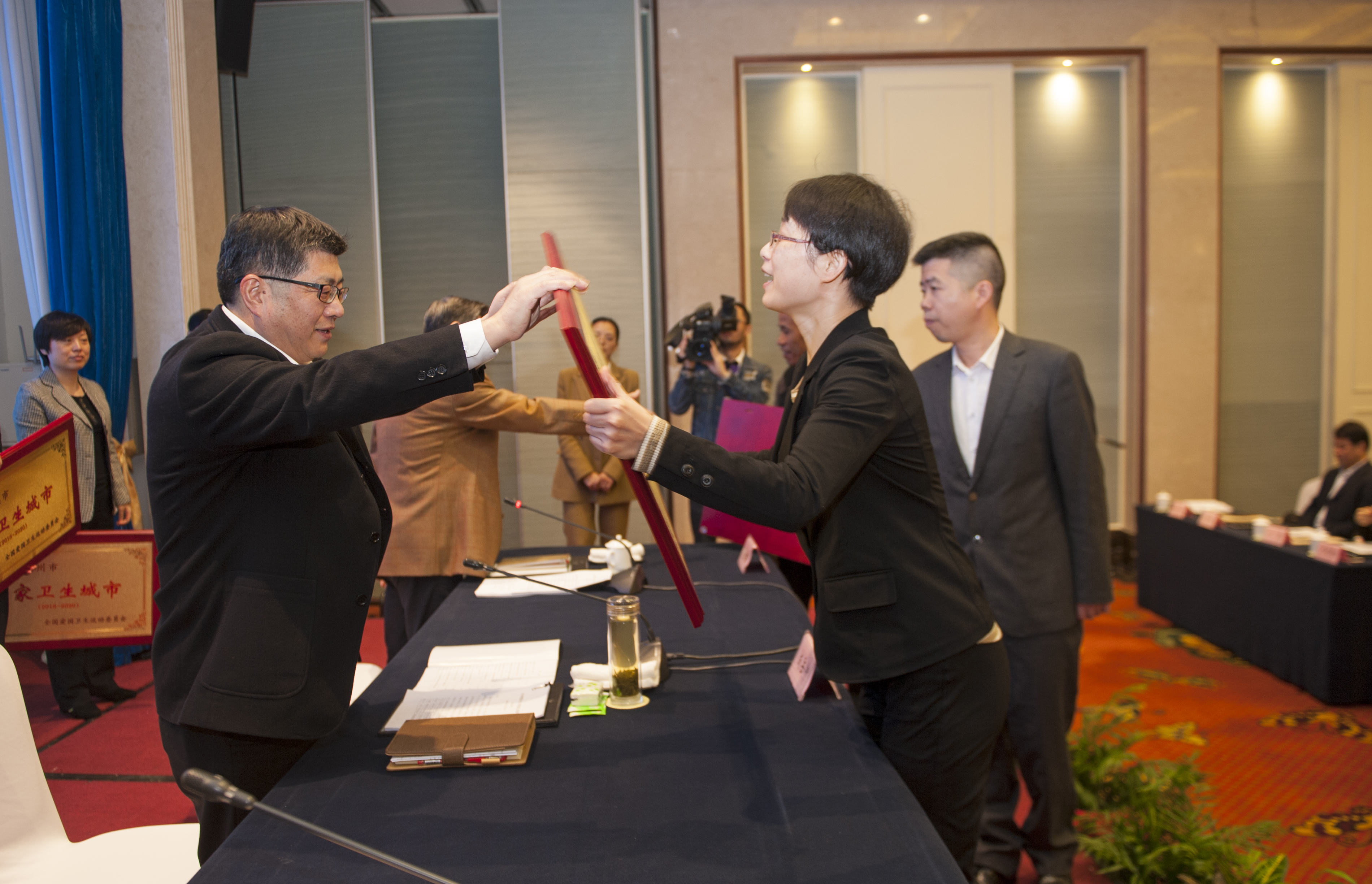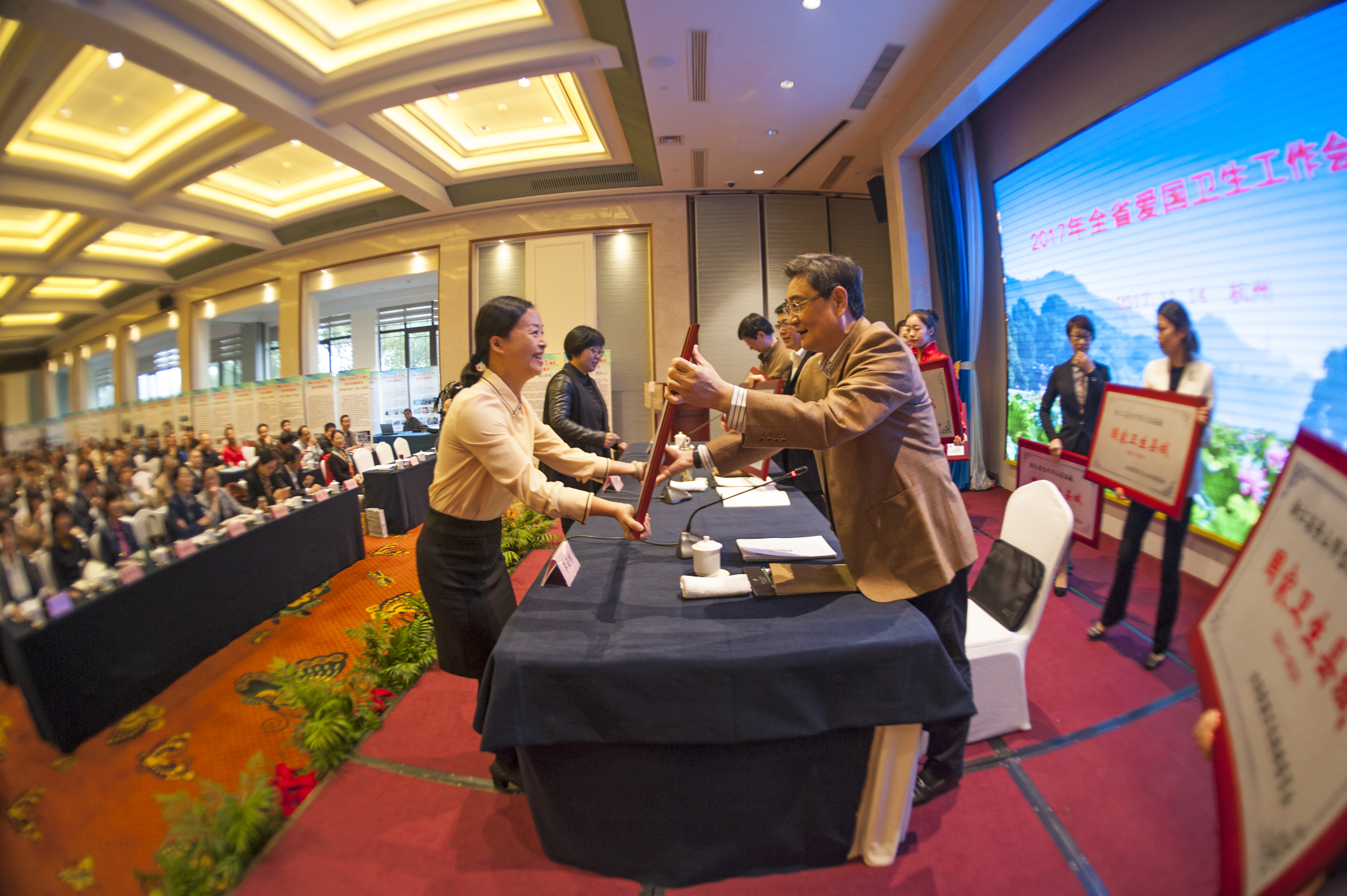 在会上,省爱卫会副主任、省卫生计生委主任杨敬通报了全省爱国卫生工作情况,省住建厅、省环保厅、丽水市、慈溪市、嘉兴市秀洲区油车港镇分别作了工作经验交流。会议还对2017年新命名的10个国家卫生城市、20个国家卫生县城进行了授牌。