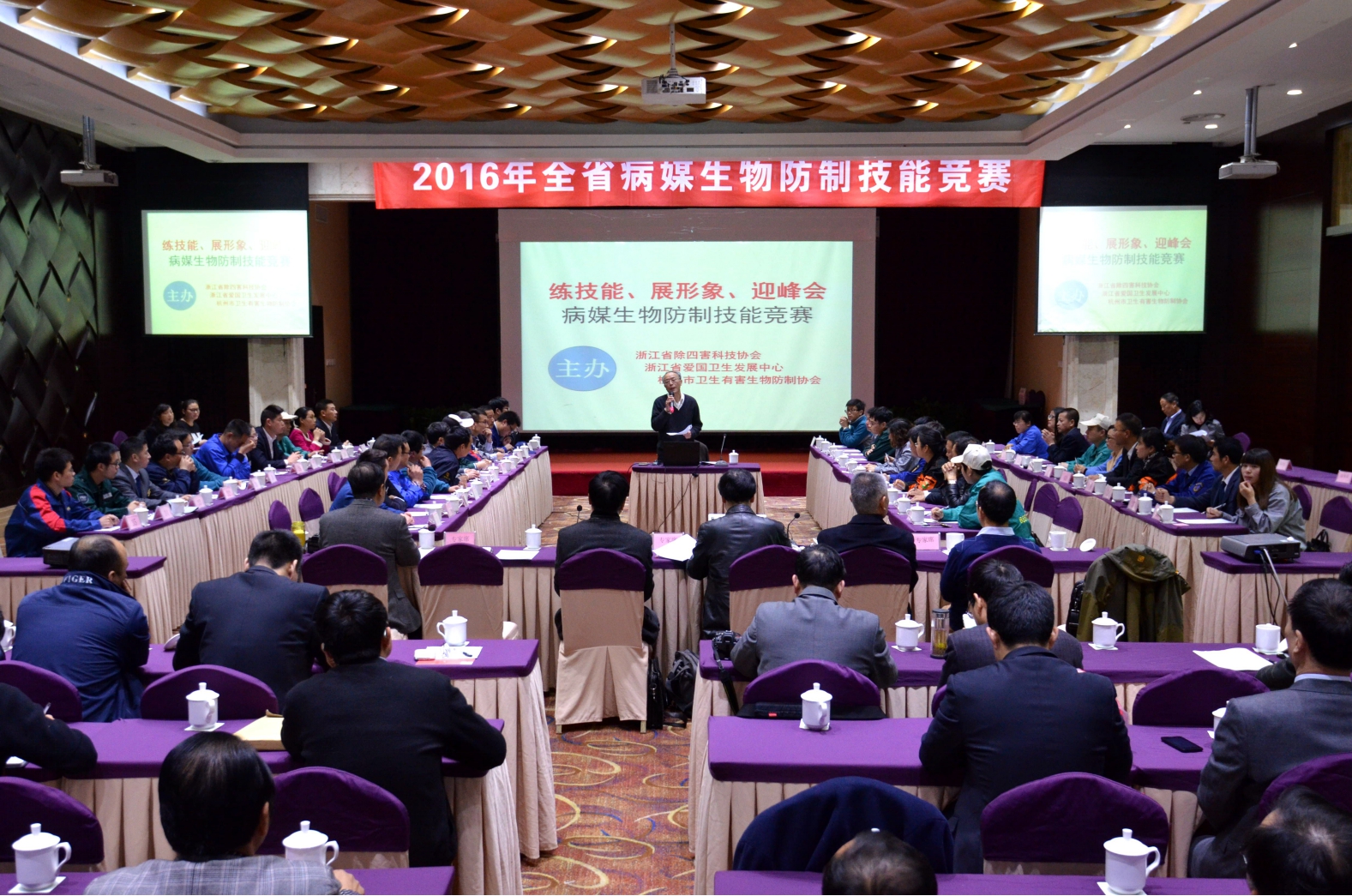 3月31日上午,省爱国卫生发展中心、省除四害科技协会、杭州市卫生有害生物防制协会联合举办全省病媒生物防制技能竞赛。来自杭州市、宁波市、温州市、义乌市等地的15家病媒生物防制服务企业的从业人员参加了竞赛。全省部分爱卫办、疾控中心、卫生监督所和20余家病媒生物防制服务企业100余人参加观摩。省爱国卫生发展中心高奕副主任、省除四害科技协会副理事长汪垂章、杭州市爱卫办副处长葛全胜出席竞赛现场。