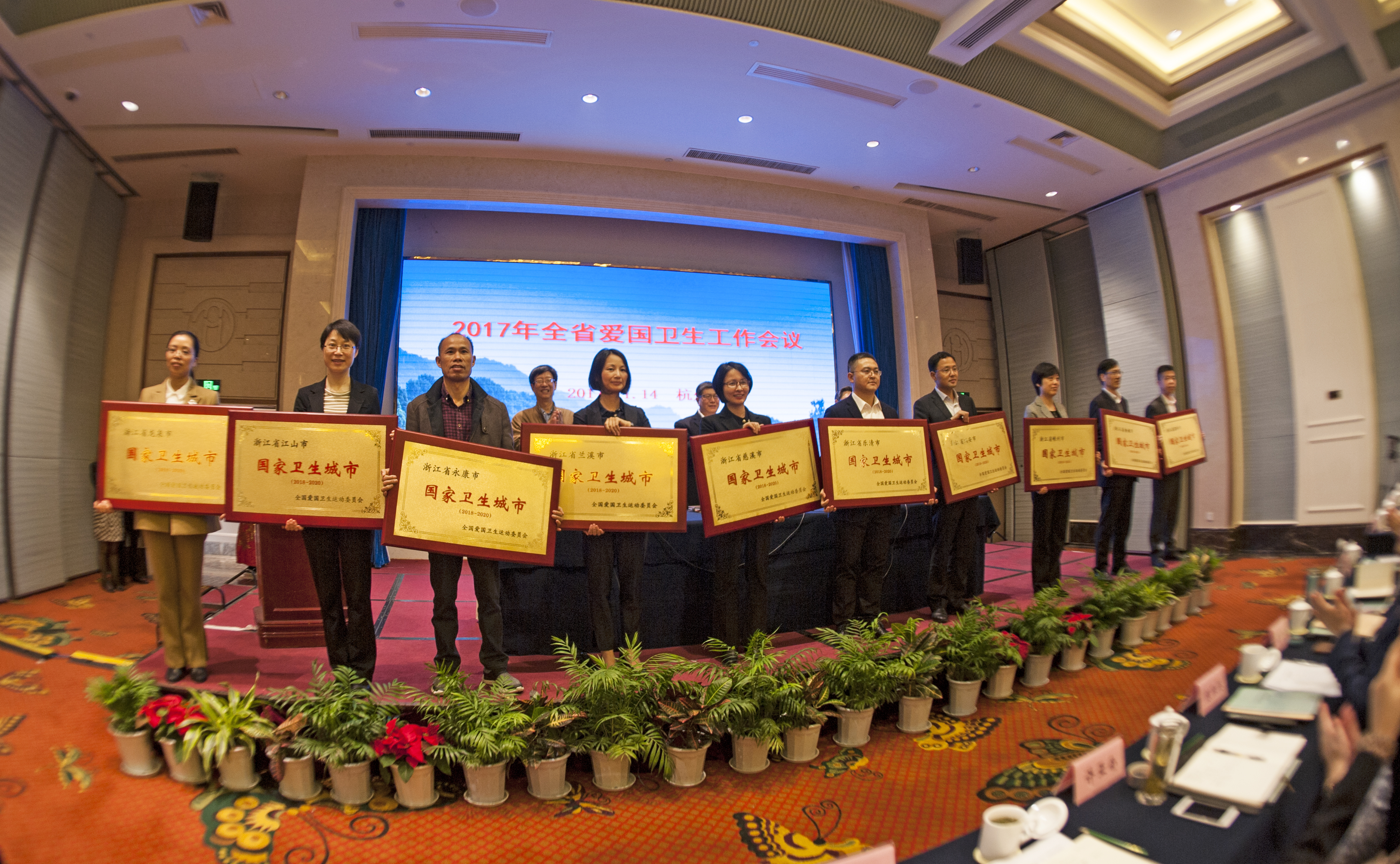 在会上,省爱卫会副主任、省卫生计生委主任杨敬通报了全省爱国卫生工作情况,省住建厅、省环保厅、丽水市、慈溪市、嘉兴市秀洲区油车港镇分别作了工作经验交流。会议还对2017年新命名的10个国家卫生城市、20个国家卫生县城进行了授牌。
